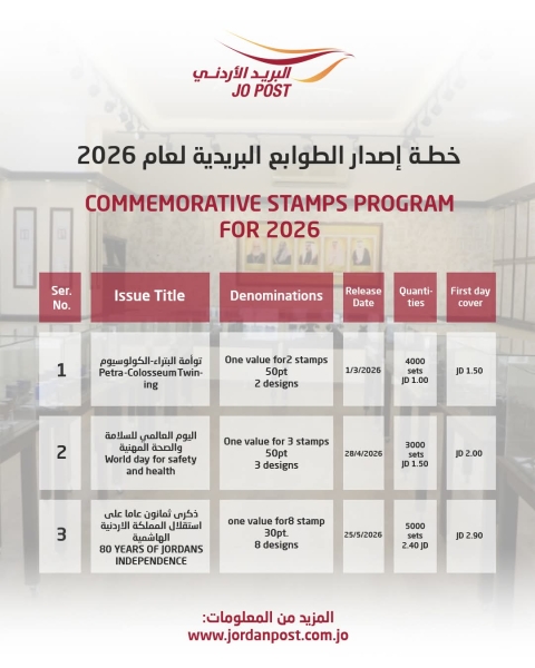 • البريد الأردني يعلن عن خطة إصدارات الطوابع التذكارية لعام 2026 .