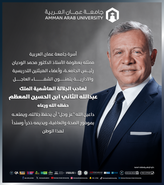• أسرة جامعة عمان العربية يتمنون الشفاء العاجل لصاحب الجلالة الهاشمية الملك عبد الله الثاني ابن الحسين حفظه الله ورعاه