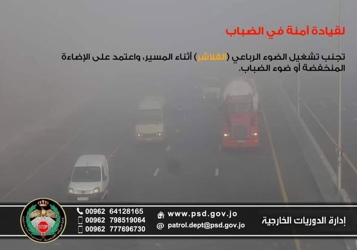 • الدوريات الخارجية تحذر السائقين من مخاطر الضباب وتوجه تعليمات للقيادة الآمنة