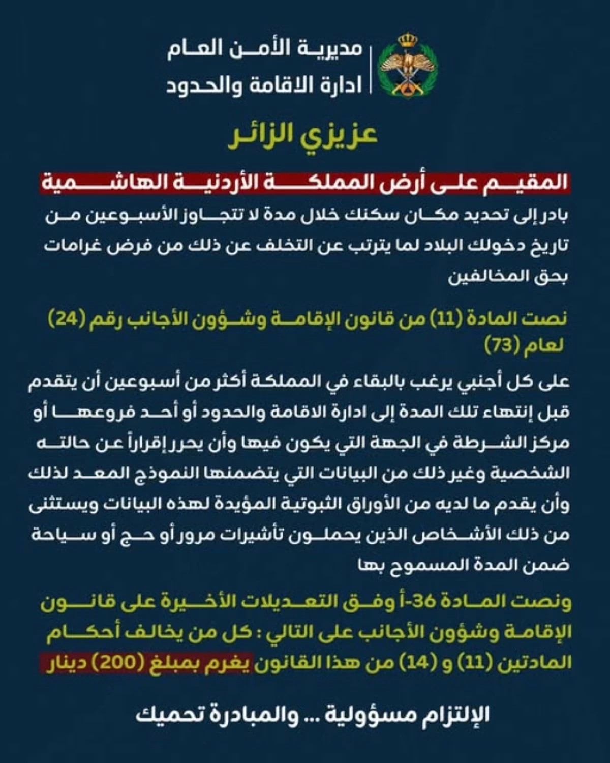 • الأمن العام : إلزام المقيمين بتسجيل أماكن سكنهم في المملكة خلال أسبوعين